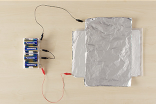 - To reduce the amount of electricity that escapes through the desk, try placing the lid of a polystyrene box or Styrofoam plate under the foil battery.