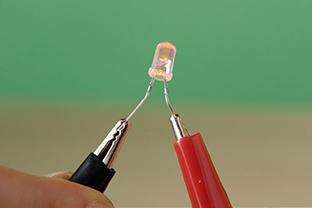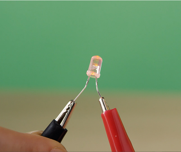 - Check the LED’s orientation to the alligator clips, as LEDs have positive and negative polarities. The longer leg is the positive terminal (connect to the red wire) and the shorter leg is negative (connect to the black wire).