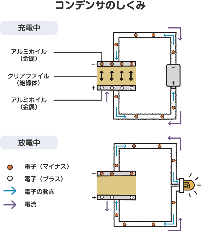 - When metal plates face each other with an insulator in between, electricity can be stored. This is the basic structure of a capacitor.