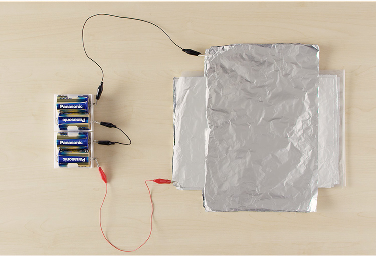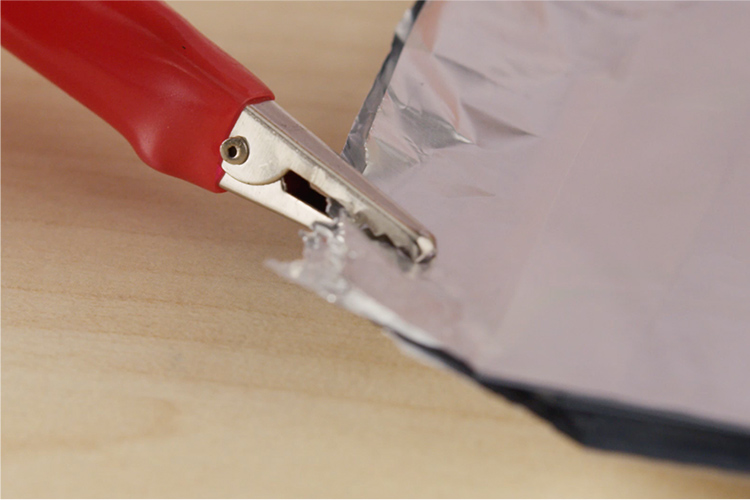 Take a red (+) alligator-clip wire and clamp it onto an exposed corner of your A-size foil bundle. Do the same thing with the B-size sheets using your other black (-) alligator wire.