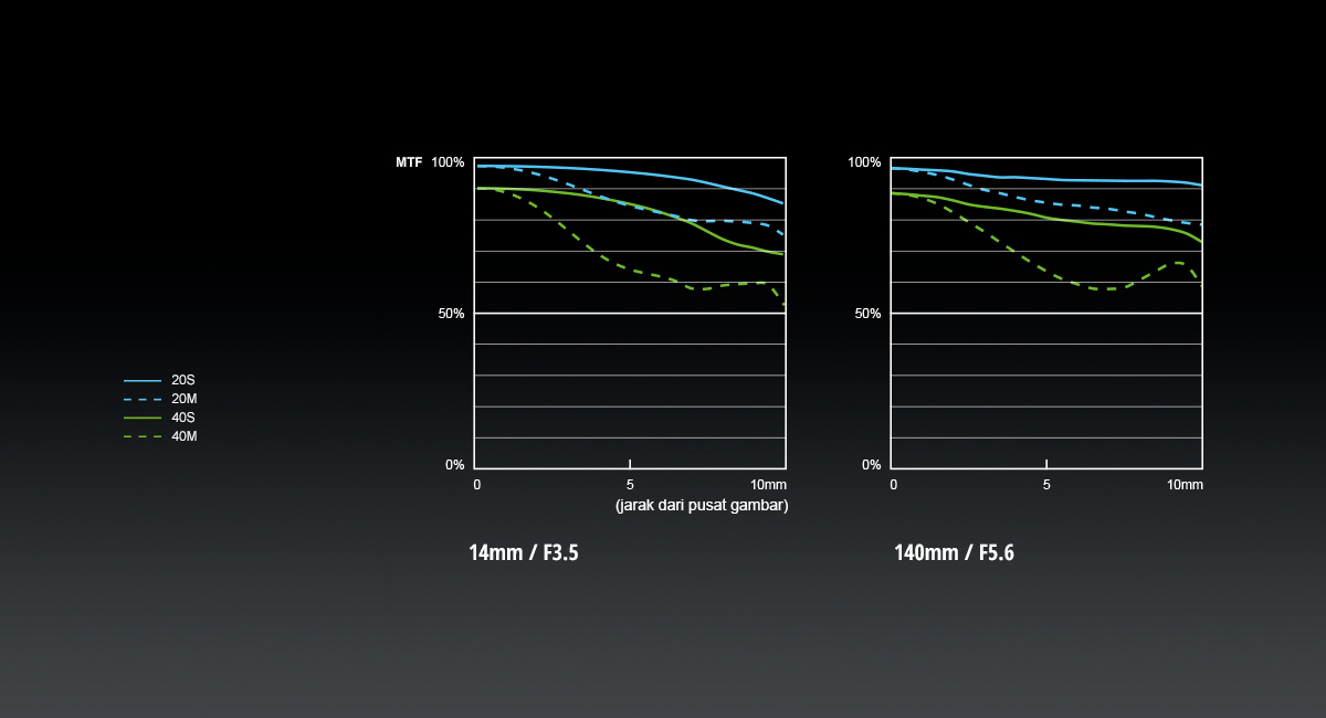 Untuk lensa dengan kemampuan mengatasi distorsi, sumbu horizontal MTF menunjukkan jarak dari bagian tengah gambar yang diperbaiki.