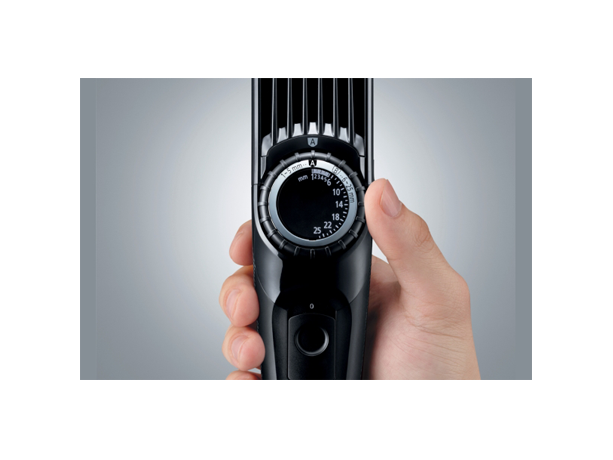 Tagliacapelli lavabile dotato di un selettore a rotella per regolare in modo rapido e preciso il taglio, con un intervallo da 1 a 25 mm. I capelli più corti possono essere accorciati fino a 0,5 mm.