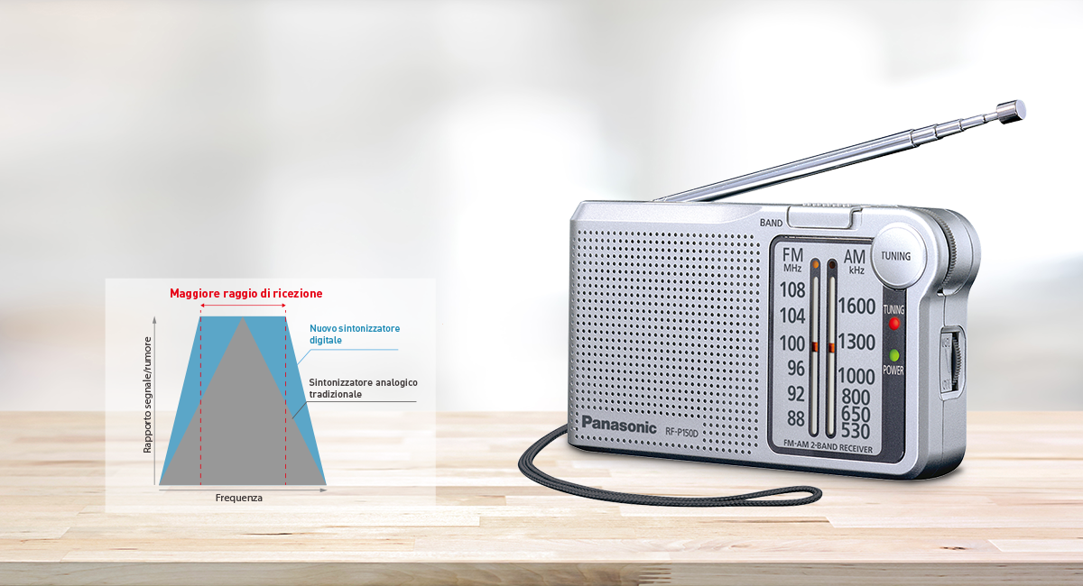 La P150D è una radio compatta facile da trasportare e posizionabile praticamente ovunque. Il selettore è semplice da leggere, anche al buio, e il nuovo sintonizzatore assicura una sintonizzazione rapida e stabile.