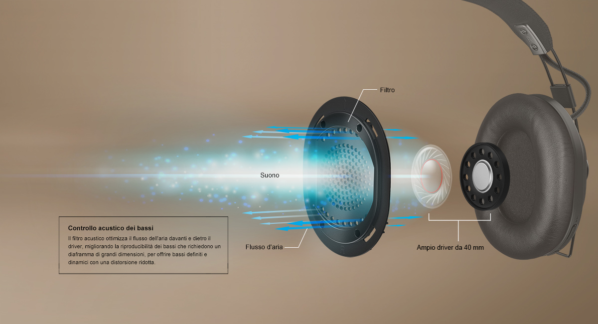 Le cuffie con unità driver da 40 mm e magnete al neodimio producono un suono particolarmente potente, grazie agli alloggiamenti a cupola. Il filtro acustico di controllo dei bassi ottimizza il flusso d'aria attorno al driver, per riprodurre un suono definito e dinamico.