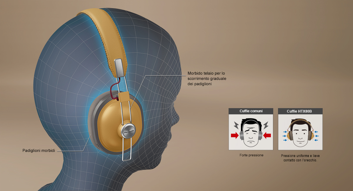 Le cuffie HTX80B presentano un morbido telaio, che allevia la pressione laterale per garantire un ascolto libero da qualunque fastidio. A contatto con la pelle i padiglioni in pelle sintetica sono molto piacevoli da indossare. Il design dei padiglioni, pensato per migliore la vestibilità delle cuffie, tiene conto della forma dell'orecchio e della distanza tra le cuffie e l'orecchio.