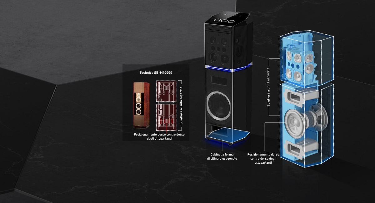 Il modello UA90 presenta struttura a unità separate, layout dorso contro dorso e cabinet a forma di cilindro esagonale per la riduzione del suono. Tutto questo è una realizzazione delle competenze tecniche di Panasonic, un perfezionamento della leggendaria