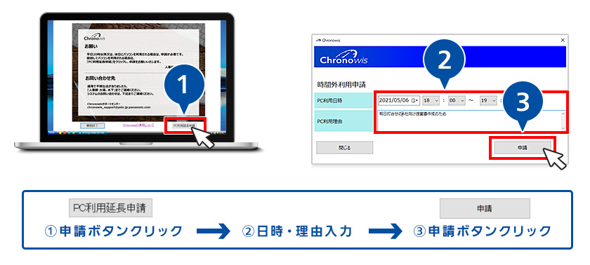 PCの利用延長にあたり、上司の事前承認要否をあらかじめ設定することで、PC利用の抑止度合を調整できます。