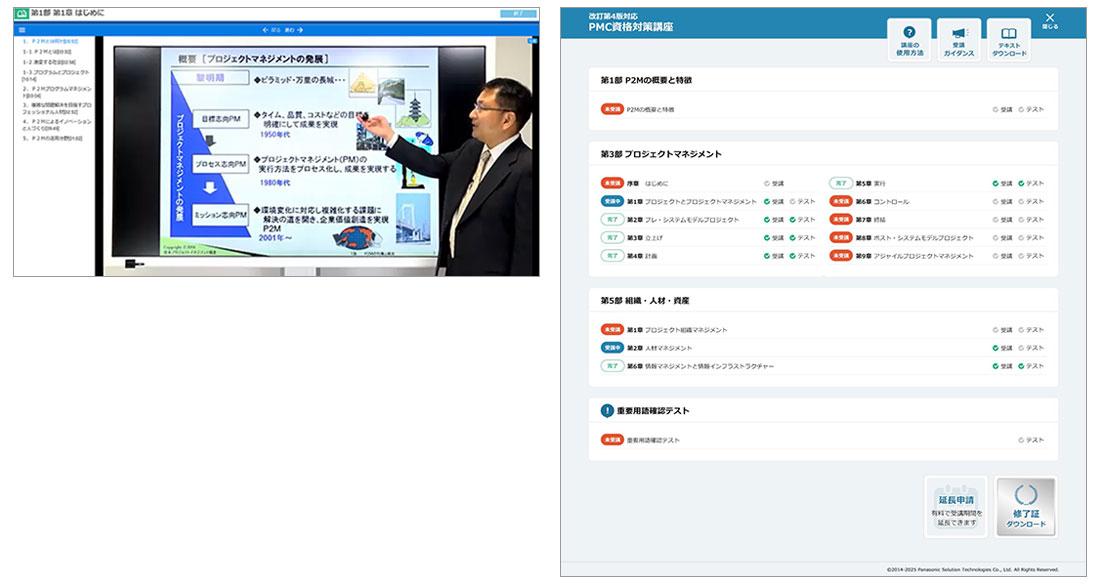 | 講座内容 | 【第1部 P2Mの概要と特徴】 【第3部 プロジェクトマネジメント】 第1章 プロジェクトとプロジェクトマネジメント 第2章 プレ・システムモデルプロジェクト 第3章 立上げ 第4章 計画 第5章 実行 第6章 コントロール 第7章 終結 第8章 ポスト・システムモデルプロジェクト 第9章 アジャイルプロジェクトマネジメント 【第5部 事業経営基盤】 第1章 プロジェクト組織マネジメント 第2章 人材マネジメント 第6章 情報マネジメントと情報インフラストラクチャー 【理解度テスト】 講座受講後、各章に設けられた練習問題にチャレンジ。講師が丁寧に解説を行います。 【重要用語確認テスト】 重要用語を理解できているか振り返るためのテストです。 【修了証について】 修了証はPDFファイルで発行します。 修了条件が満たされた後、講座メニュー画面より修了証がダウンロードできます。 修了条件は次の3つの条件を全て満たす必要があります。