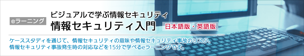 情報セキュリティの意味や情報セキュリティ事故のリスクや発生時の対応などを理解度テストで確認しながら短時間で学習できるeラーニングです。