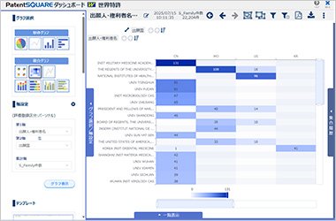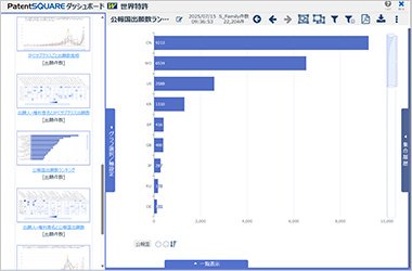 「PatentSQUARE」の「知財BIダッシュボード」機能は、国内・外のプレイヤーを含む有望な新規領域や競合調査、包括的な分析が可能。