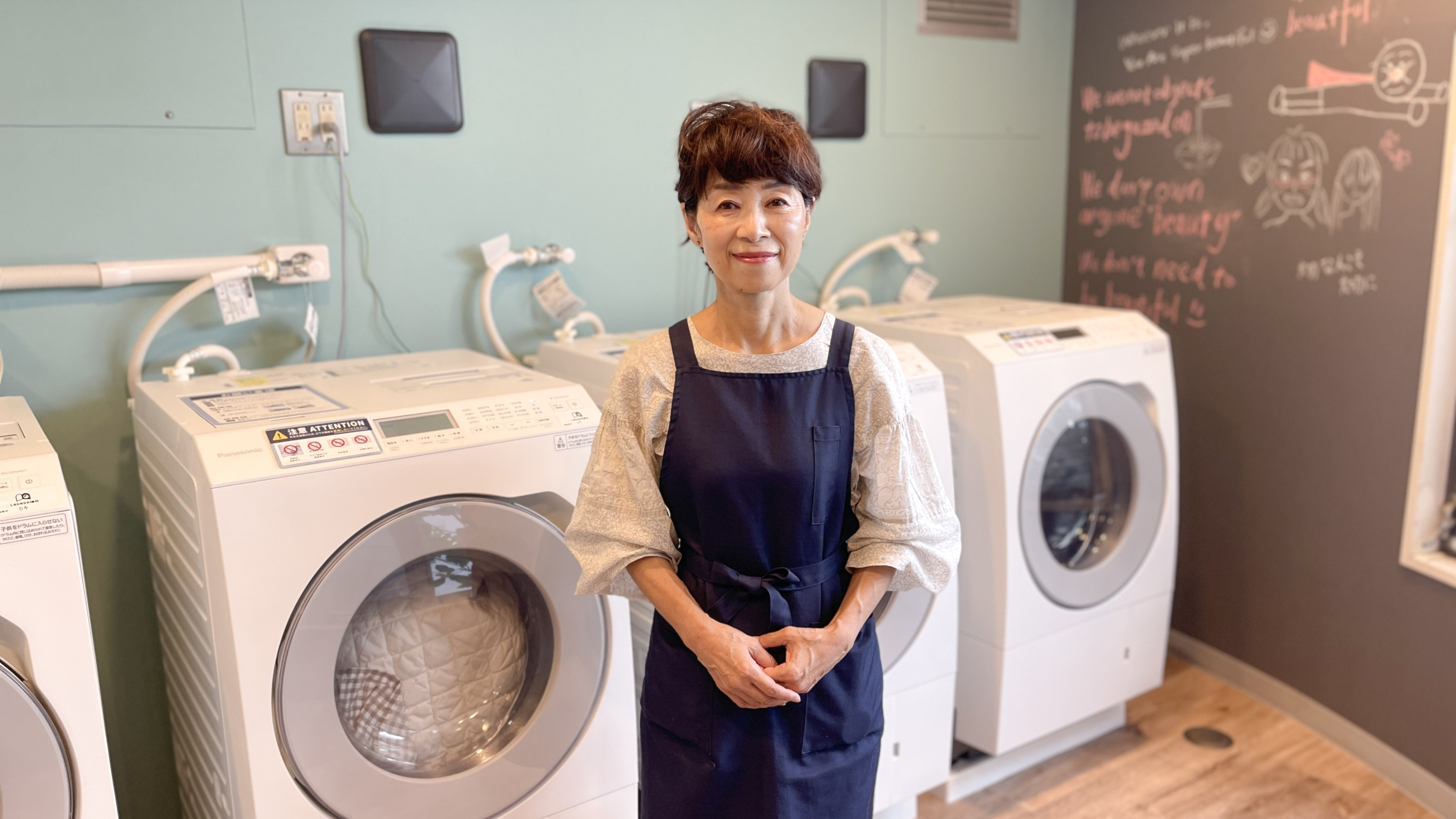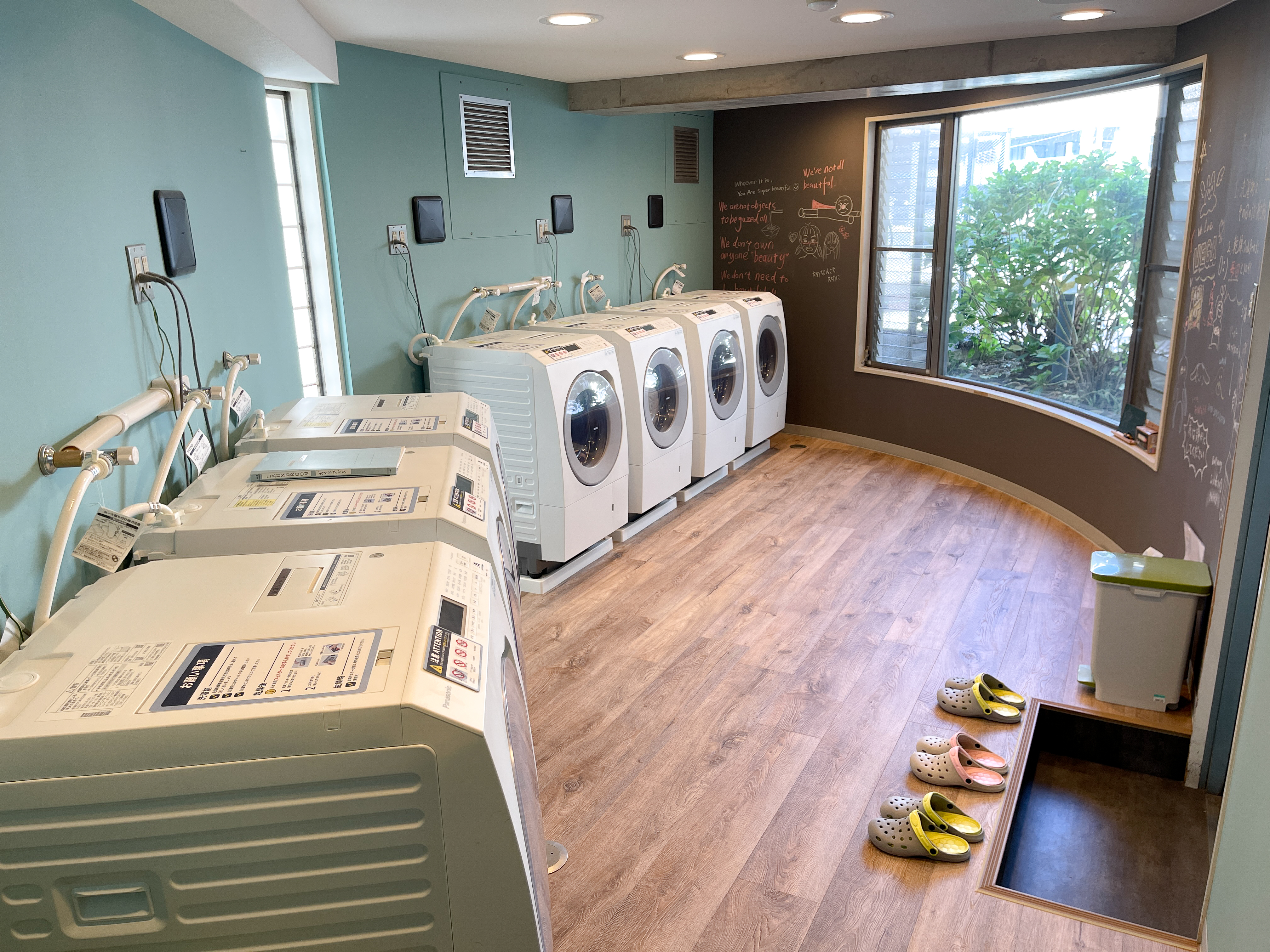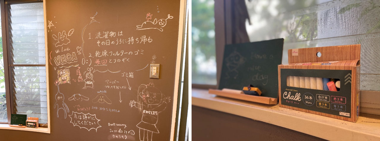 導入決定後、せっかく洗濯機を新しくするならと、ランドリールーム全体のリニューアル工事も実施することになりました。コンセプトは「カフェのような空間」。壁や床を明るく、清潔を保ちやすい素材に変更し、壁面の一部は黒板ボードにして寮生が自由にメッセージを書き込めるように。「ランドリールームを楽しい場所にしていきたかったんです」と丸山さん。