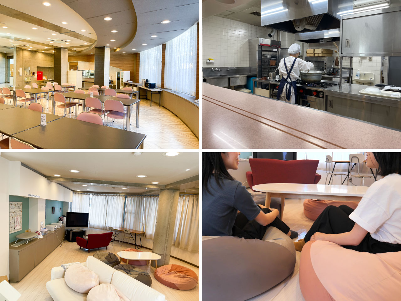▲正面玄関には食堂があり、毎日の朝夕の食事が提供されています(上段)。談話室などの共用スペースも充実。勉強や生活の間にリフレッシュでき、寮生間の交流も自然に生まれます(下段)。