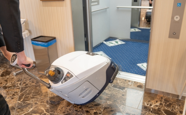 次に、「RULO Pro」が動くのは、チェックインが落ち着く深夜0時ごろ。主にフロント業務を担当するナイトスタッフが「RULO Pro」をスタート位置まで運び、約300m2のロビーを約1時間40分かけて自律走行していく。ここは基本的に、タイルカーペットであるが、一部、タフテッドカーペットと大理石も敷いてある複合フロアとなっているものの問題なく走行できている。従来までは、メインフロントのバキュームがけはエリアを分け、数日かけてワンフロアを除塵していたが、「RULO Pro」導入後は、毎日、全面を均一に除塵するため、人手をかけず、メンテナンスができている。