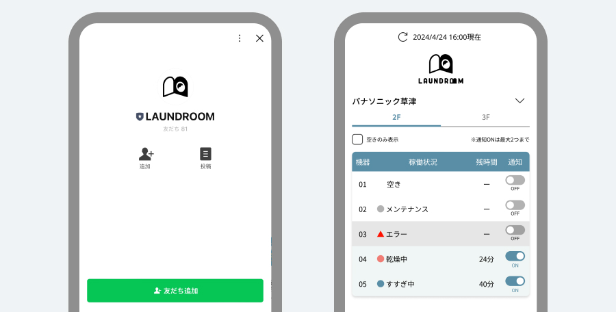 LINEで洗濯機の空き状況を確認したり、洗濯完了の通知を受け取ることができます(※ランドリールーム登録が必要)。空き状況の確認はブラウザでも可能です。