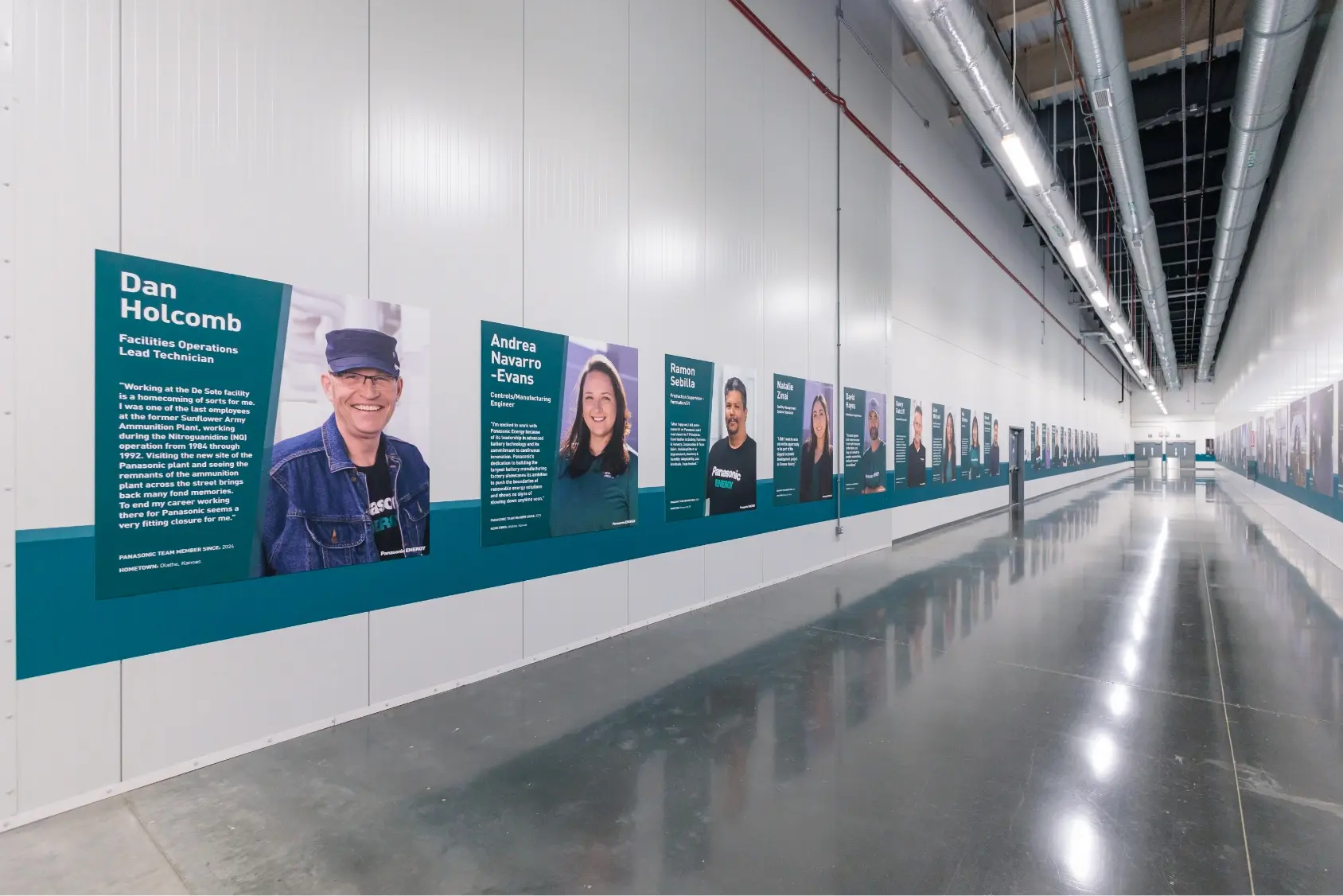 カンザス工場の通路には従業員紹介のパネルを掲示している。
