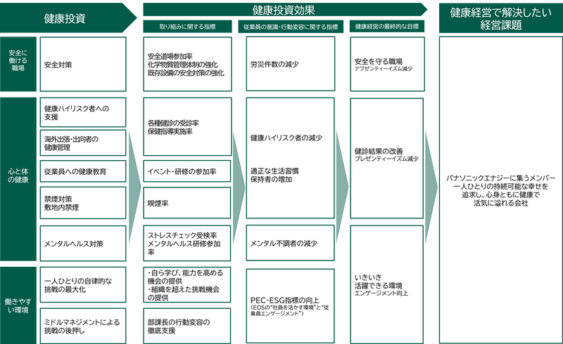 パナソニック エナジー株式会社は、当社事業の持続的成長と発展に向けては、当社に集うメンバーの「安全」・「安心」・「健康」の維持が何よりも重要であると捉え、『一人ひとりが活きる経営』の実践を基本に、ここに集うメンバー一人ひとりの持続可能な幸せを追求し、心身ともに健康で活気に溢れる会社となるよう、健康に関する様々な取り組みを体系化し実践しています。