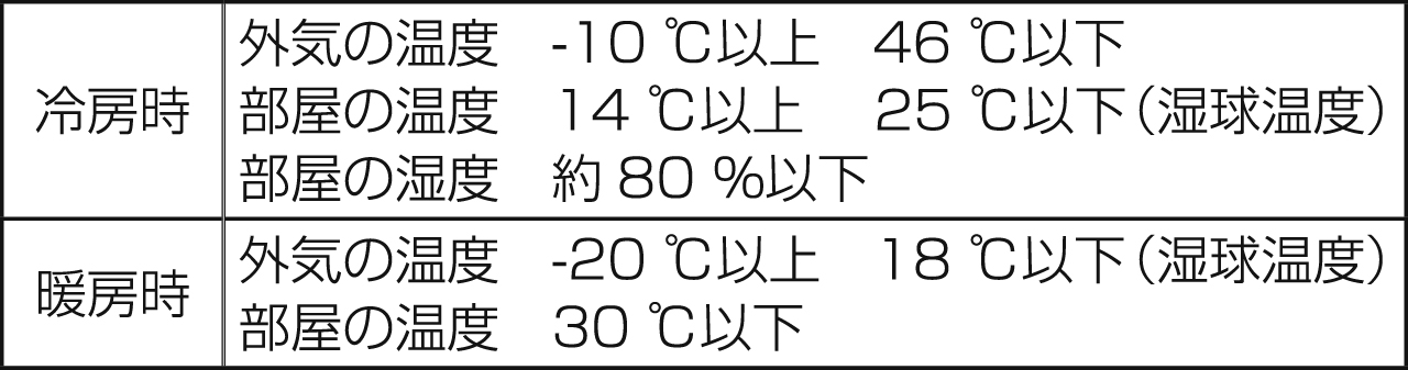 - 上記以外の条件で長時間運転すると、保護装置が働き、運転停止や故障の原因になります。