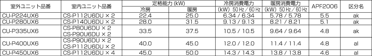 - この仕様値はJIS B8616パッケージエアコンディショナに基づいた数値です。APF2006、区分名はエネルギーの使用の合理化に関する法律に基づく経済産業省告示第213号(平成21年)による表示です。