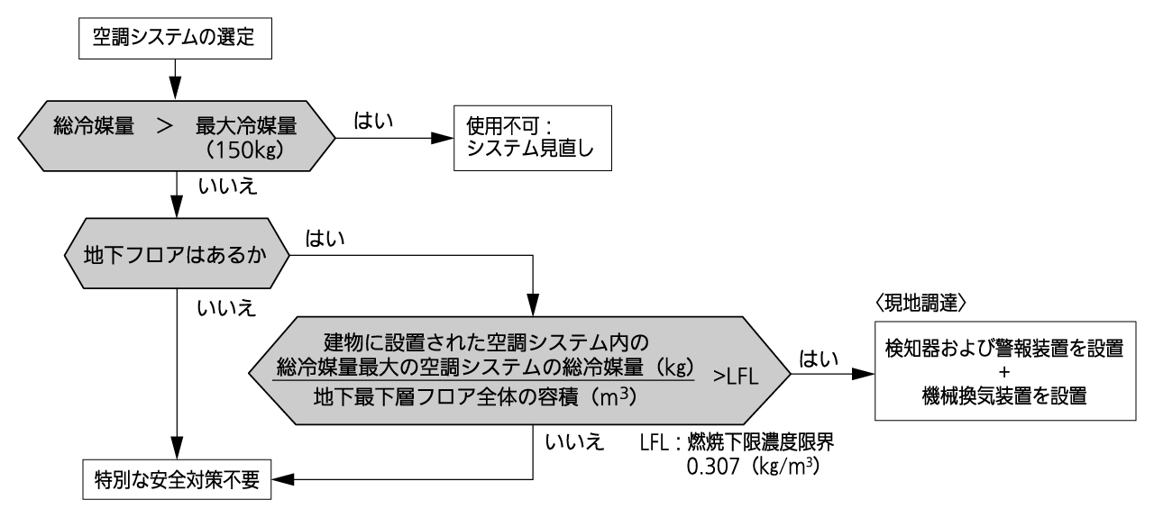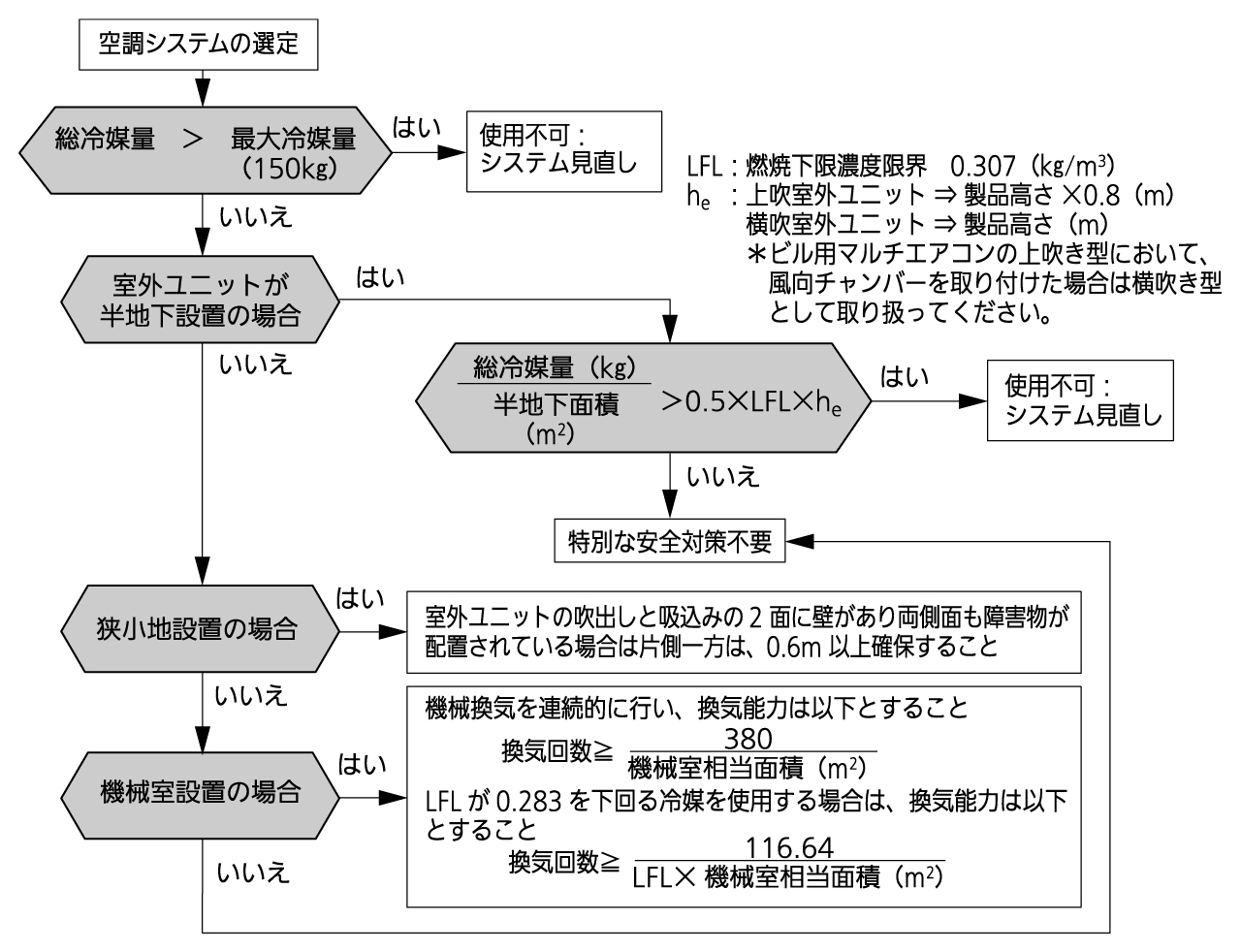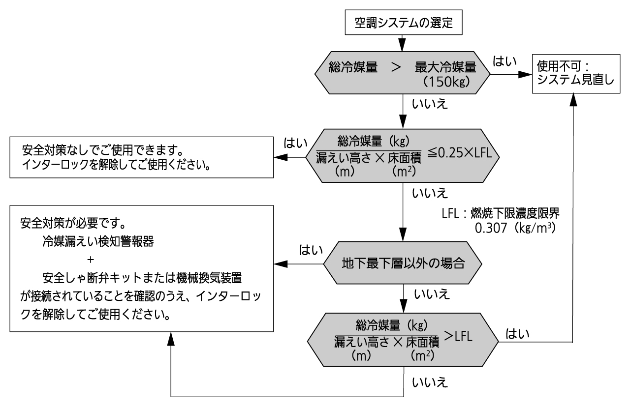 ●業務用エアコンを設置する場合は、最初に安全対策が必要か不要かを確認する必要があります。そのため、冷媒漏えい時の安全対策判定についてのフローチャートで確認してください。
