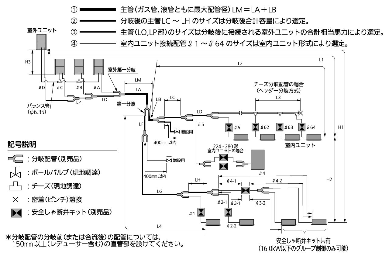 ※1. 最大配管長(L1)が90m(相当長)を超える場合は、主管(LM)の配管サイズをガス管、液管ともに1ランクサイズアップしてください。