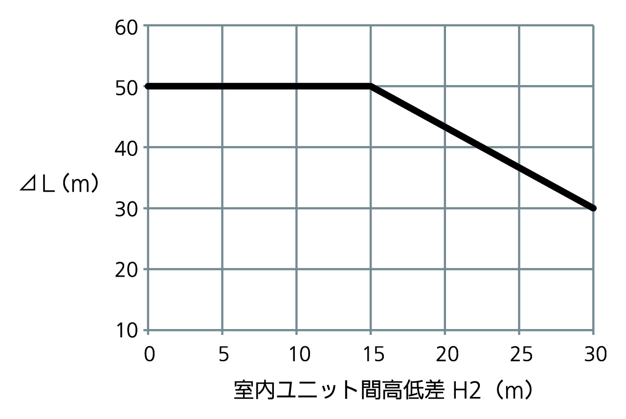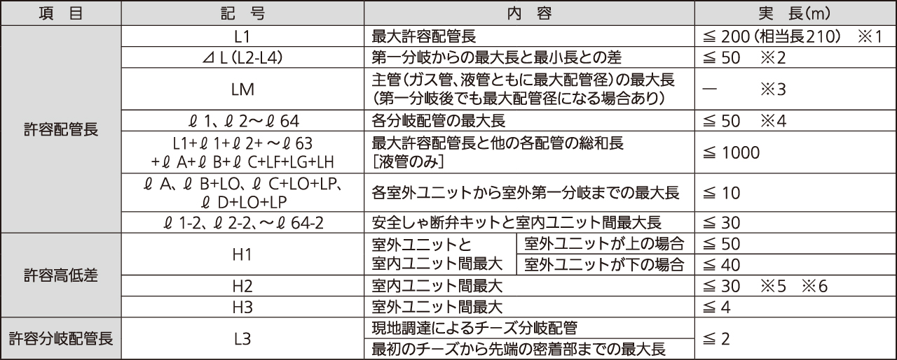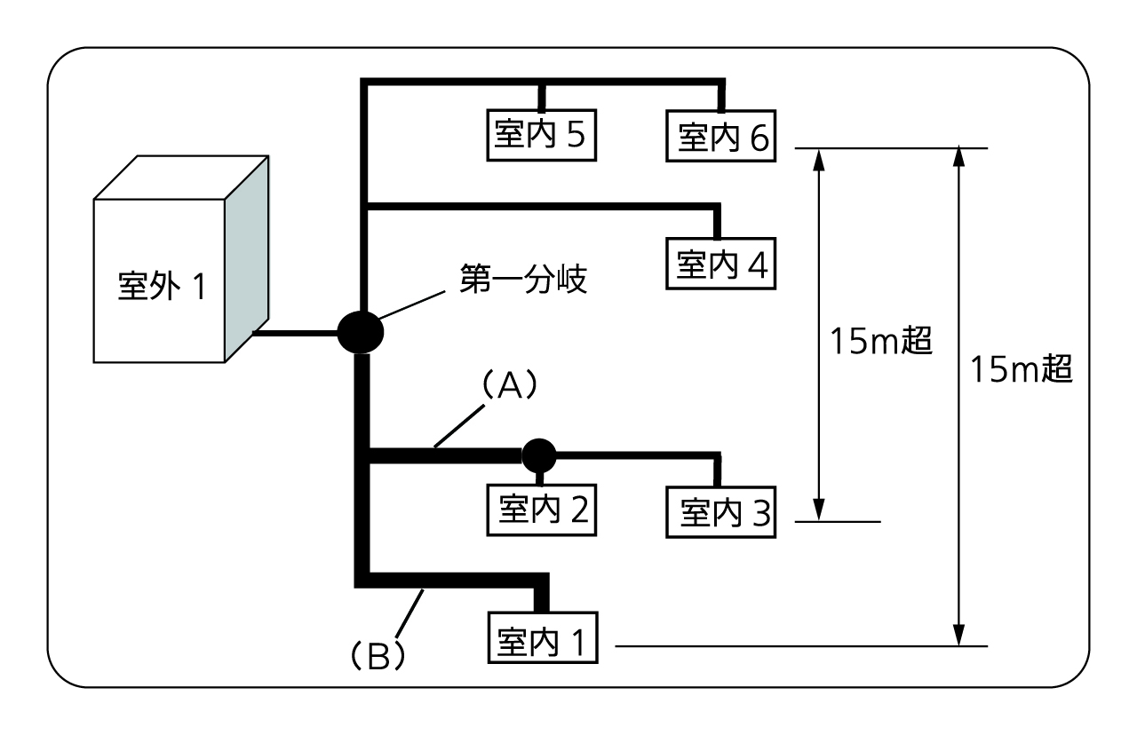 (詳細は「H2(室内ユニット間最大)が15mを超える場合の対応について」を参照してください) - ガス管、液管ともに1ランクサイズアップの必要な個所があります。