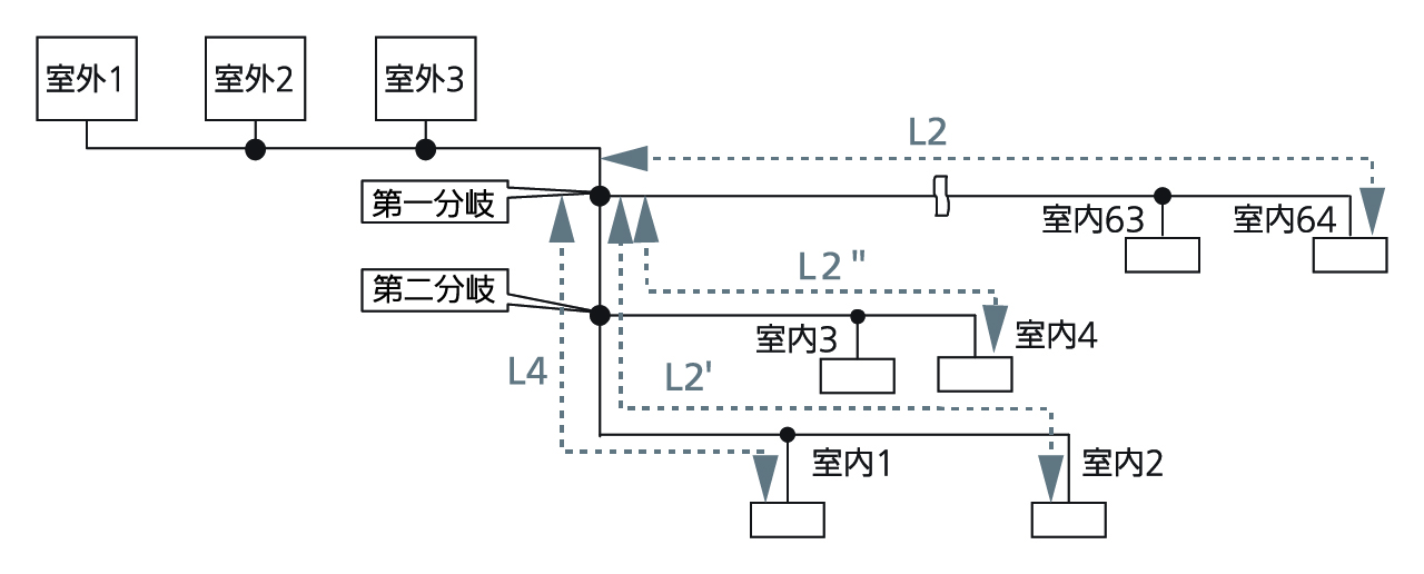 - L2(L2'、 L2"):室内ユニットの群で、一番遠くにある室内ユニットまでの配管長さ