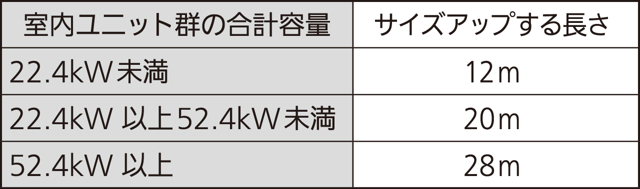 配管をサイズアップする長さは、室内ユニット群の合計容量によって、異なります。表2を参照してください。