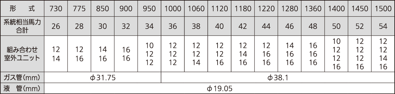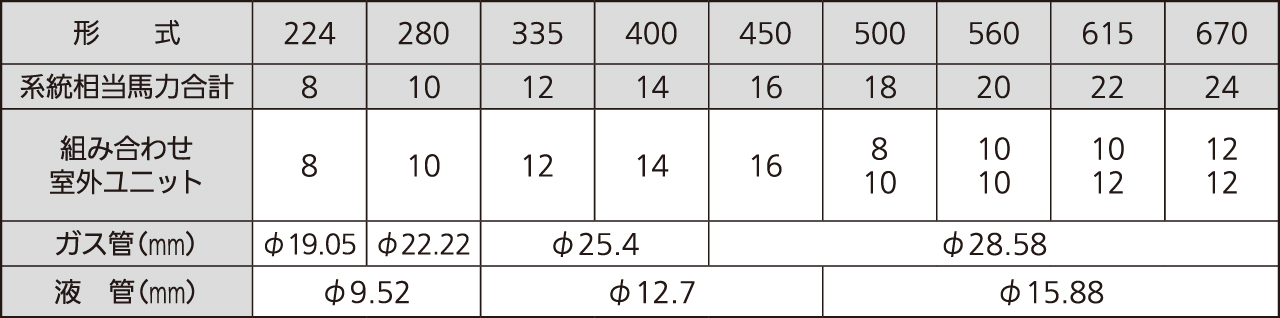*将来増設予定のある場合は、増設後の系統相当馬力合計により配管径を選定してください。ただし、配管サイズが2ランクアップになる場合は増設できません。