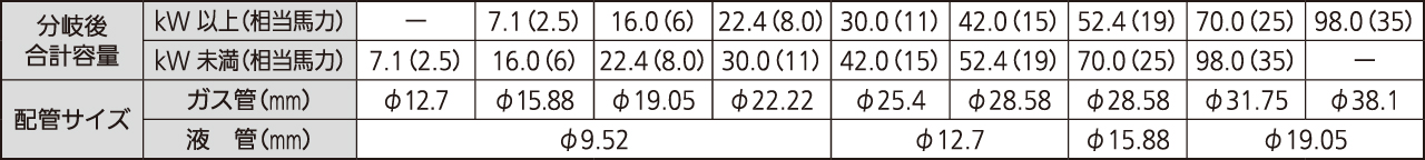 *分岐後に接続される室内ユニットの合計容量(=冷房能力)が室外ユニットの合計容量(=組合せ室外ユニット冷房能力)を超える場合、主管サイズは室外ユニット合計容量で選定してください。