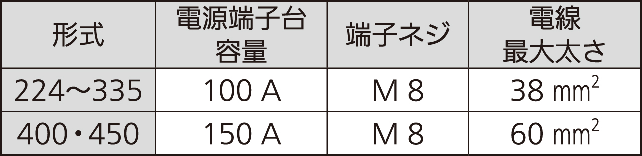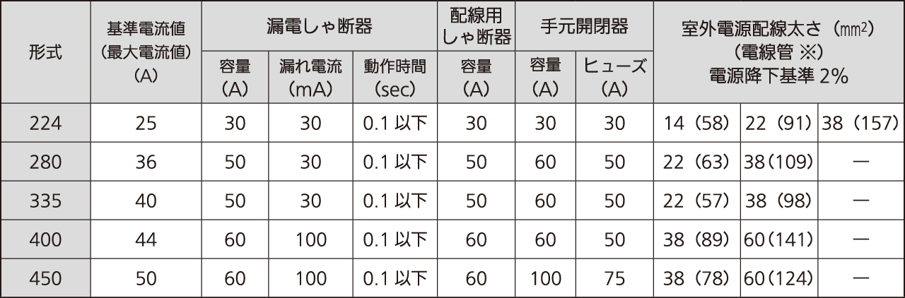 - 基準電流値は配線選定の際に使用した数値で、運転範囲中の最大電流値を示します。供給電源量も基準電流値に基づいて選定してください。