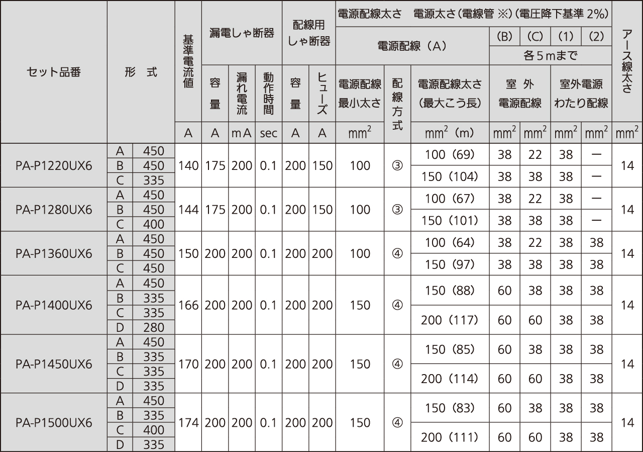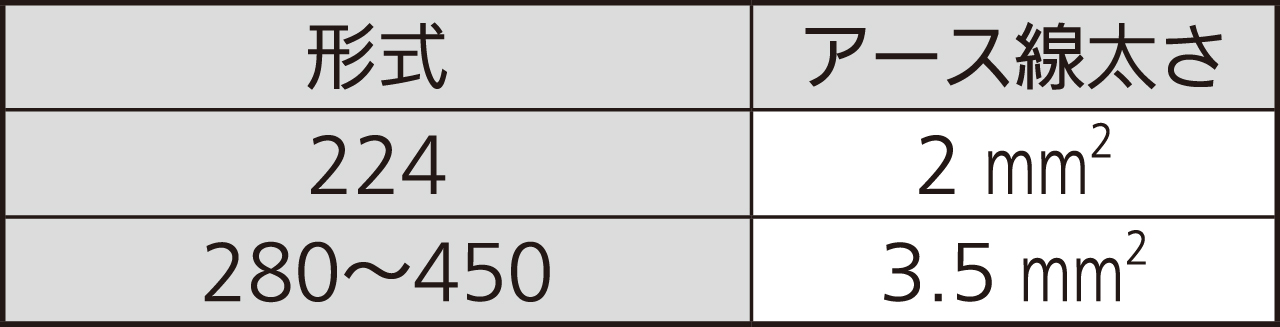 (注2) 電源配線を分岐する場合には、関連法規に従って漏電しゃ断器を取り付けてください。ただし5mまでで下表の太さのものを使用していただければ漏電しゃ断器の取り付けは必要ありません。