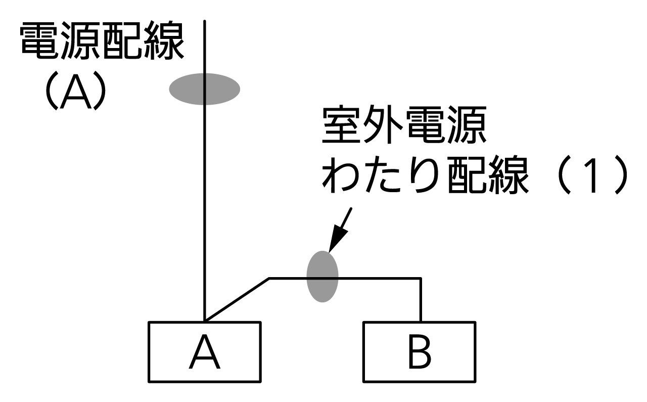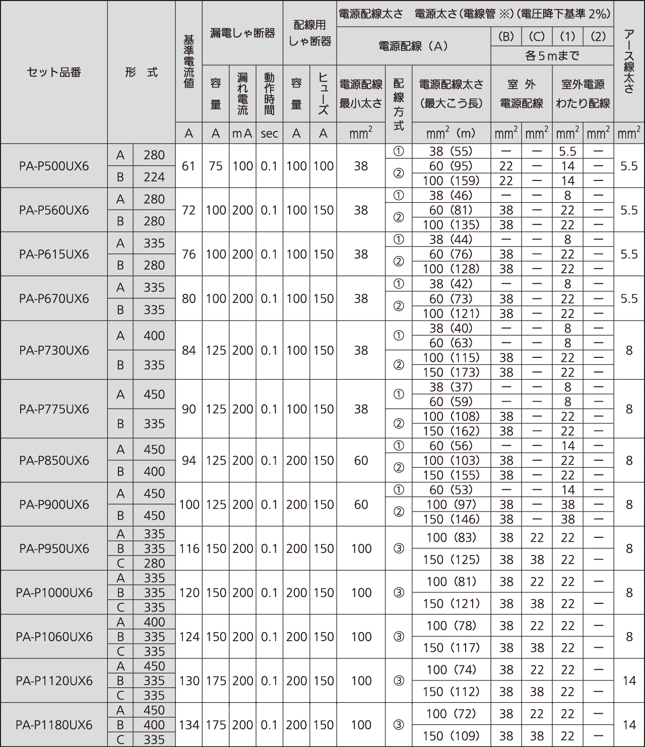 (注1) 電源太さが室外電源端子板の電線最大太さを超える場合は、電源盤からの電源線をプルボックスで中継し(室外ユニット近傍)、下表に従ってサイズダウンをしてから入線してください。この場合、室外電源配線(A)が必要となります。