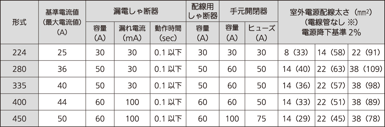 - 基準電流値は配線選定の際に使用した数値で、運転範囲中の最大電流値を示します。供給電源量も基準電流値に基づいて選定してください。