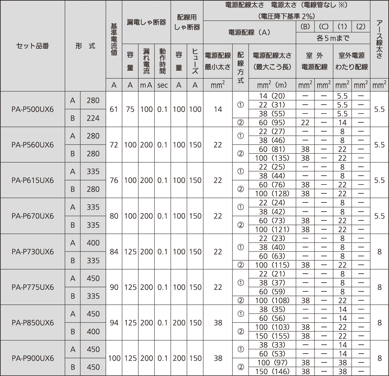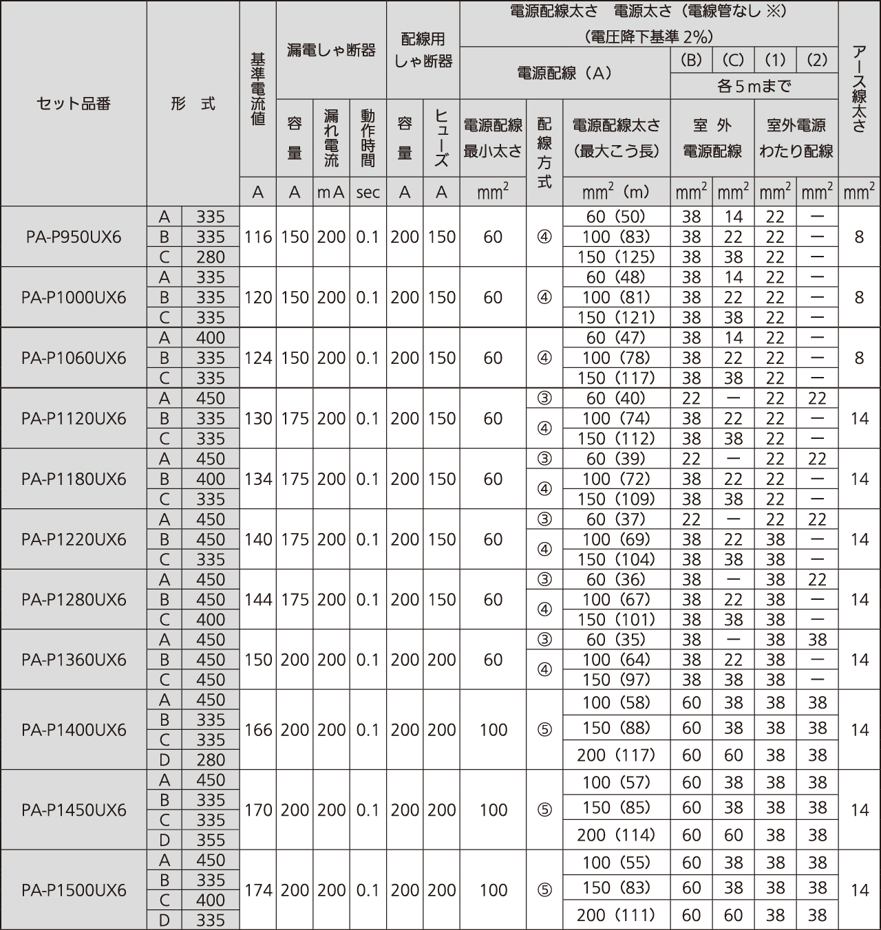 (注2) 電源配線を分岐する場合には、関連法規に従って漏電しゃ断器を取り付けてください。ただし5mまでで下表の太さのものを使用していただければ漏電しゃ断器の取り付けは必要ありません。