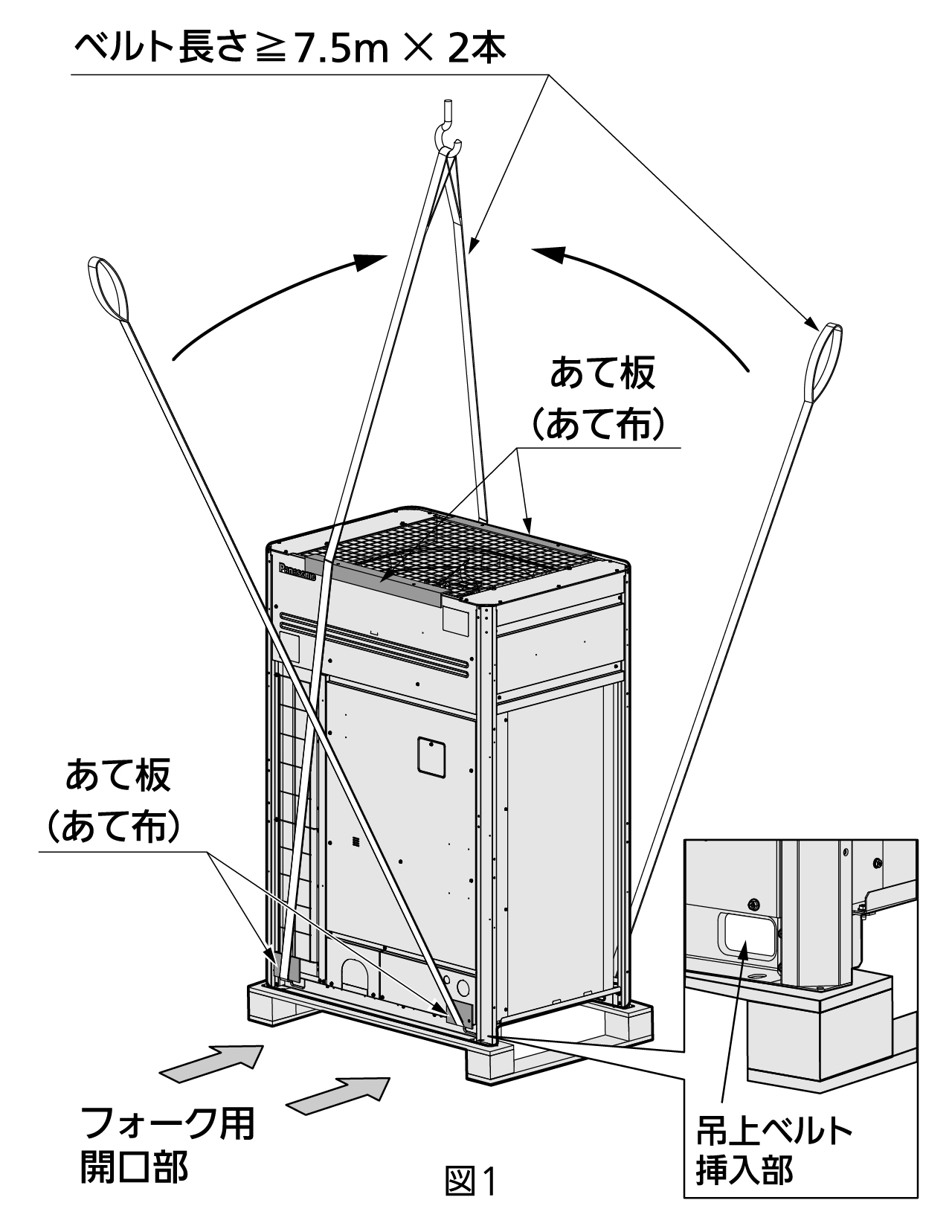 クレーンで吊り上げる場合は、ユニットを傷つけないようベルトを使用し、以下の点に注意して、図2の要領で吊り上げてください。 - ユニット吊り上げ用のベルトは、長さ7.5m以上のものを2本使用してください。(図1)