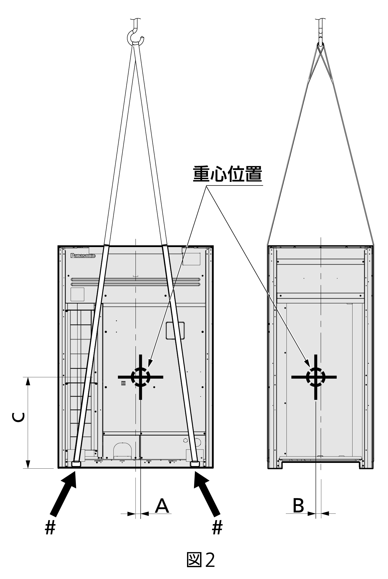 - ベルトを掛けるときは、必ず図2に示す矢印#の位置にある正面、背面各2か所の吊上ベルト挿入部にベルトを通してください。