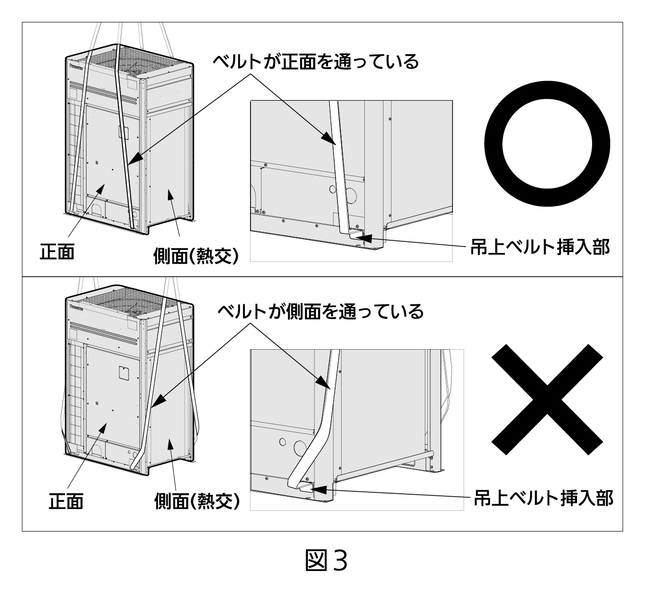 - 吊り上げたとき、バランスが崩れないようにするため、ベルトはたるまないようにしっかりと掛けてください。また、掛けたベルトがはずれないように対策をしてください。(図3)