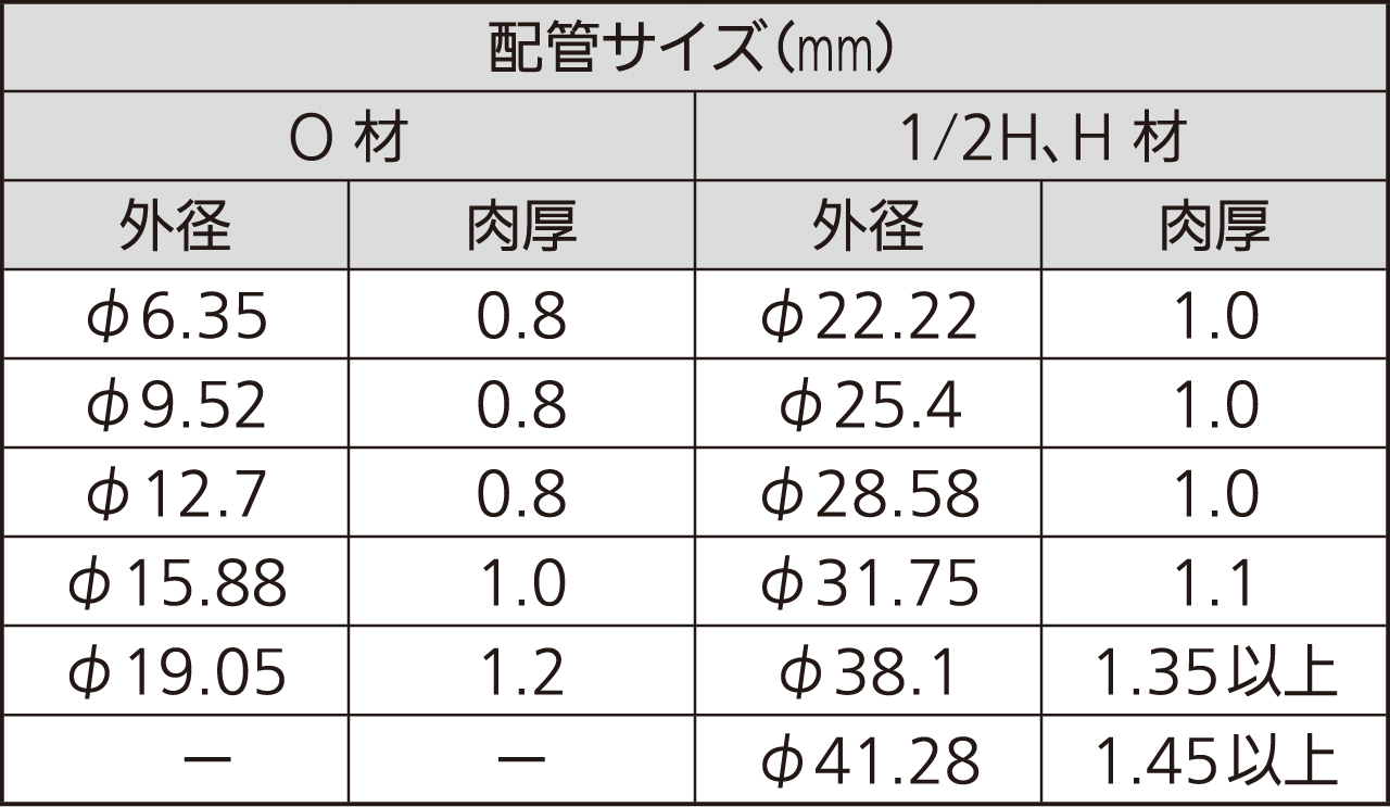 - 材質:JIS H3300「銅管及び銅合金継目無管」C1220Tのりん脱酸銅を使用してください。(外径φ22.22以上の配管は1/2H材、H材、その他はO材)(表1)