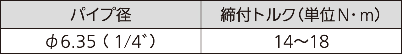 - フレアナット締め付けは、必ず表2のトルク内で締め付けてください。規定トルク以上の力が加わると閉鎖弁内部のシート面が歪み、閉鎖弁内部でガスが漏れたり、フレア部破壊の原因となります。