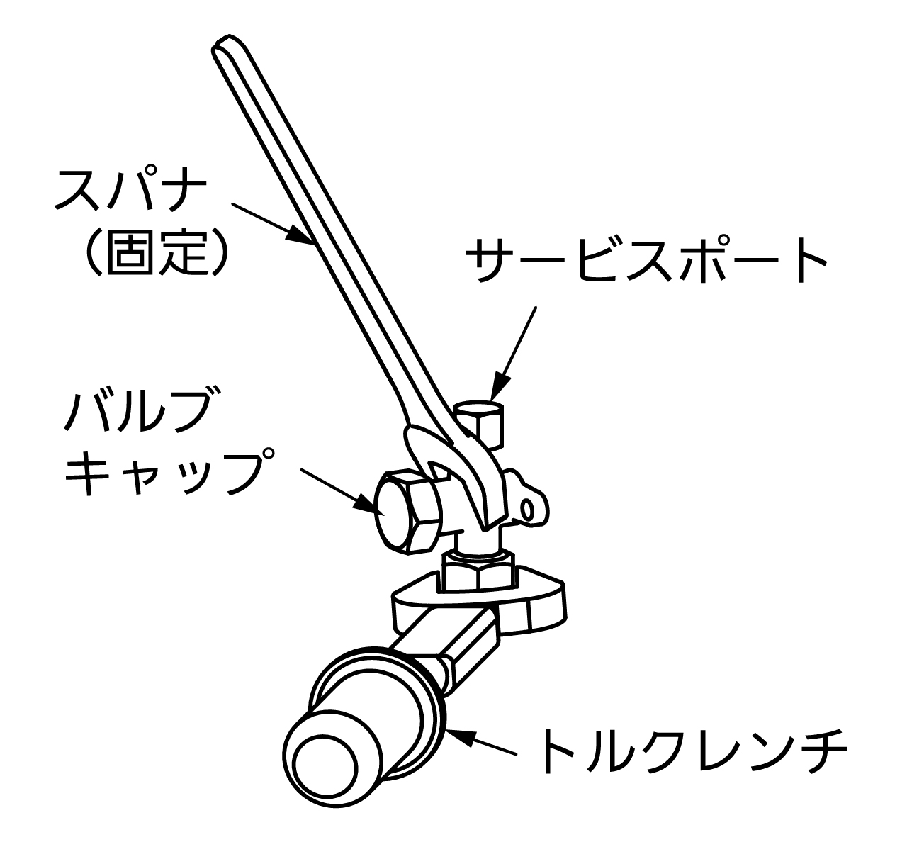 - フレアナットを取りはずすとき、取り付けるときは、バルブキャップにスパナを掛けないでください。弁が壊れるおそれがあります。