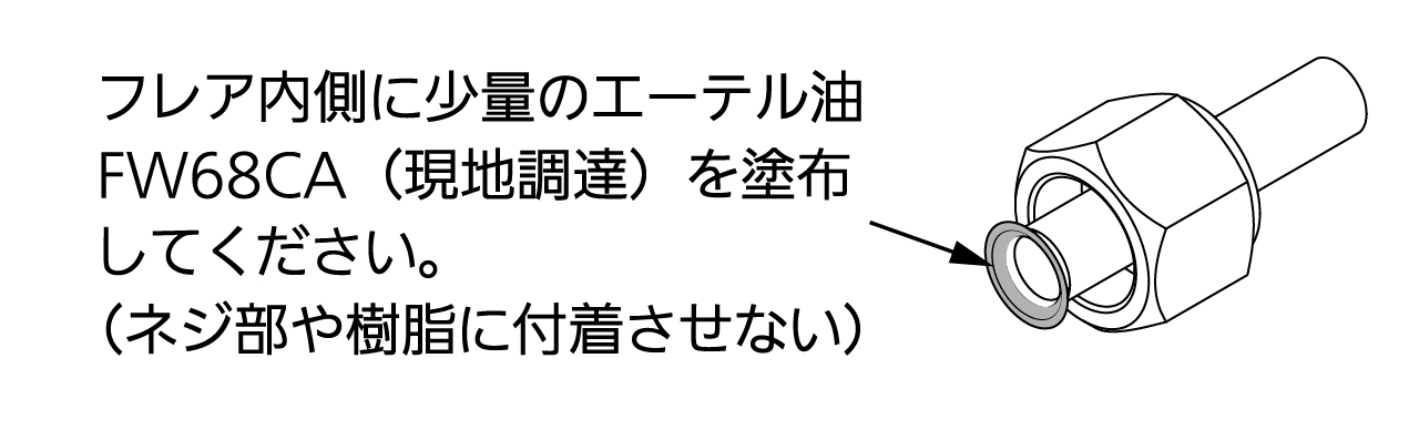 - フレア接続時、フレア部に塗布する冷凍機油は、少量のエーテル油FW68CA(現地調達)を使用し、またその際にネジ部や樹脂部品に油が付着しないように注意してください。(樹脂部品の強度が弱くなり割れや露付き、水漏れの原因になります)