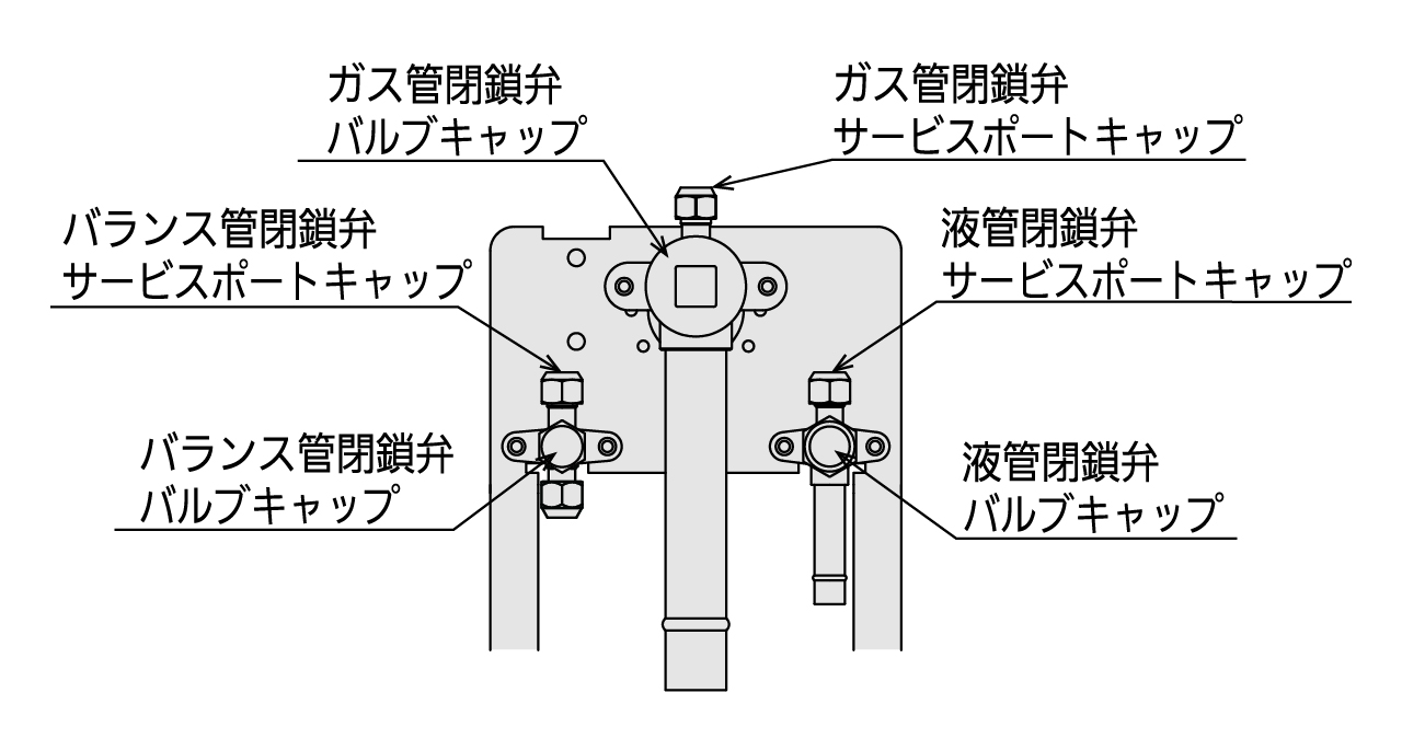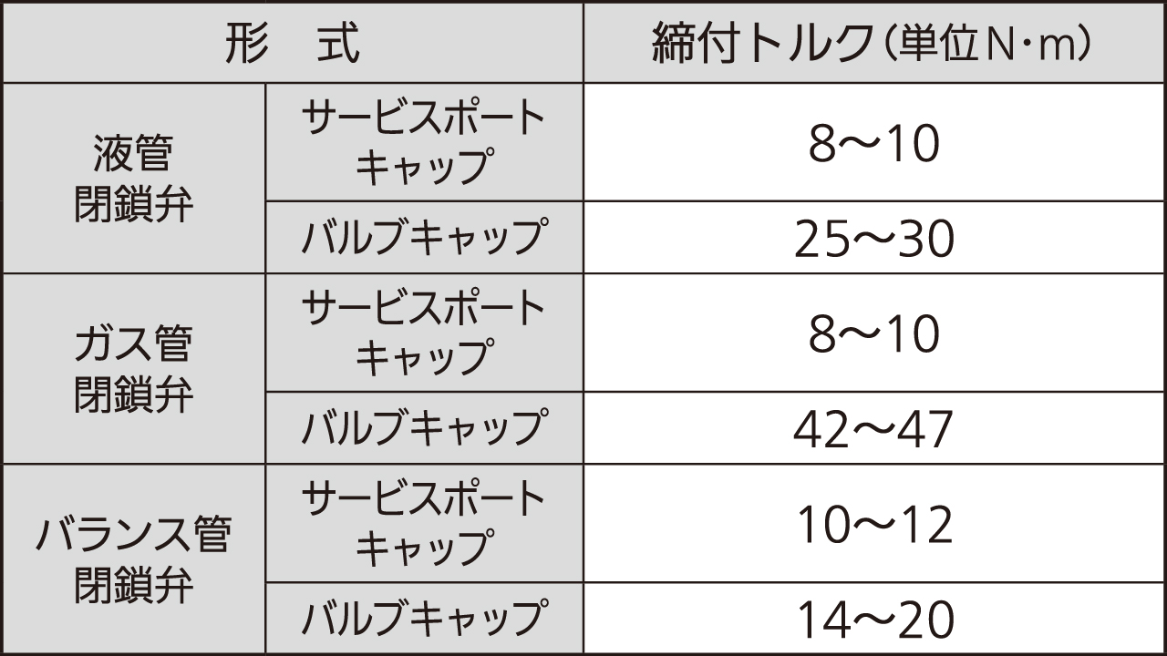 - バルブキャップをしない状態で長時間放置しますと冷媒が漏れますので、バルブキャップは作業後速やかに閉めてください。