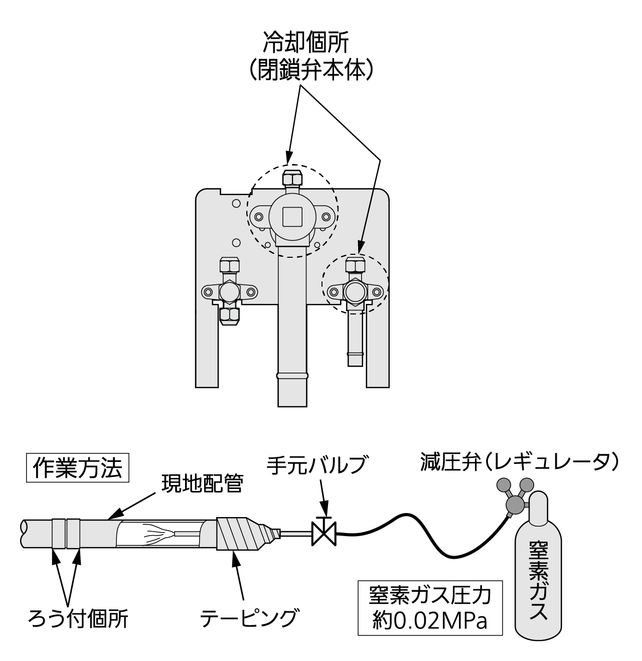 1)配管接続のろう付時は酸化被膜防止のため配管内を必ず窒素ガス置換してください。ろう付時は必ずぬれた布等で閉鎖弁本体を十分に冷却しながら行ってください。