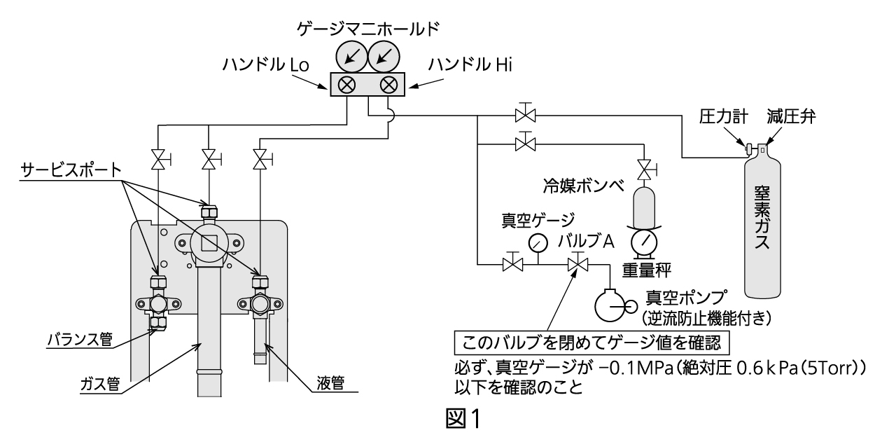 - ガス管、液管、バランス管のサービスポートに窒素ガス、真空ポンプ等を接続してください。