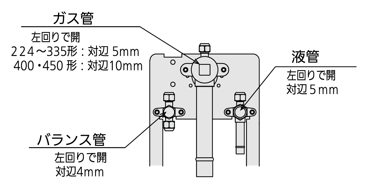 - このとき、ガス管、液管、バランス管の閉鎖弁は「閉」のままです。