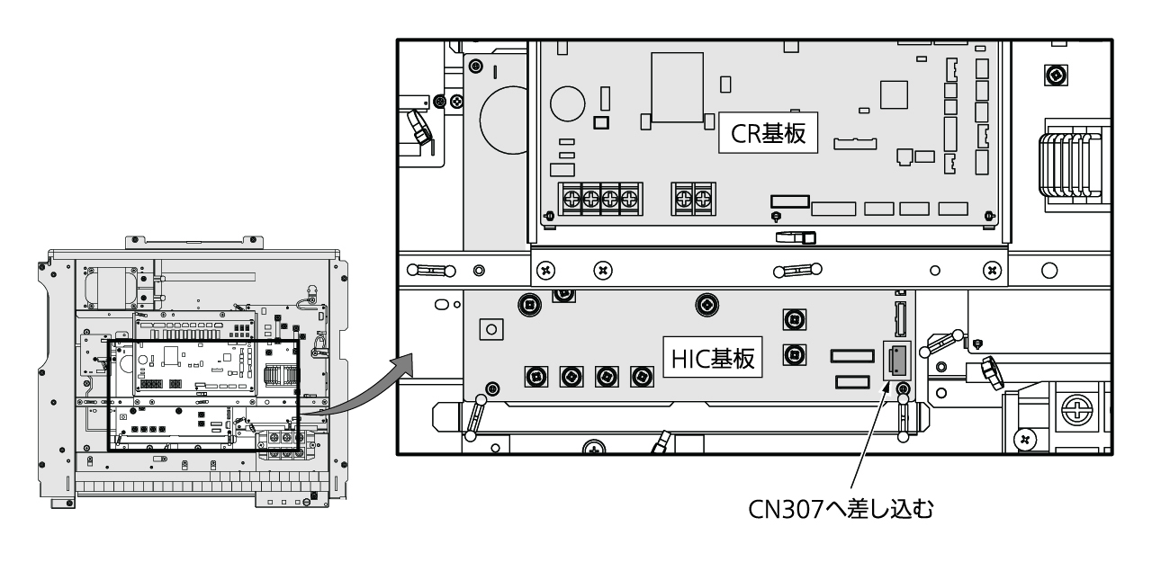 注意ラベルが貼ってある安全対策インターロック・高圧スイッチソケットを室外HIC 基板(電気回路図参照)