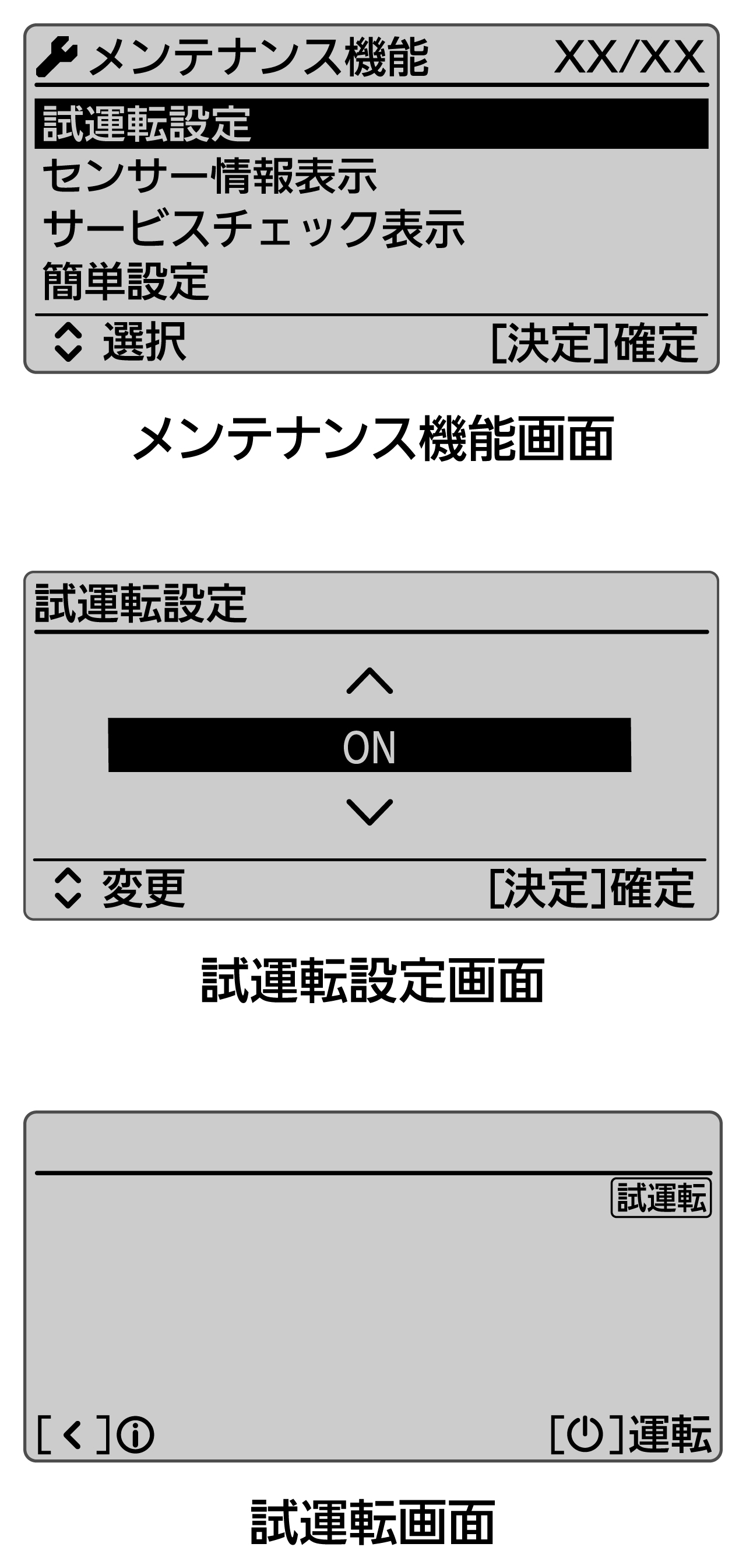 暖房、冷房のいずれかの運転モードを使用してください。- 試運転を終了後は再度、上記メンテナンス機能→[試運転設定]を選択、試運転設定[OFF]を選び、