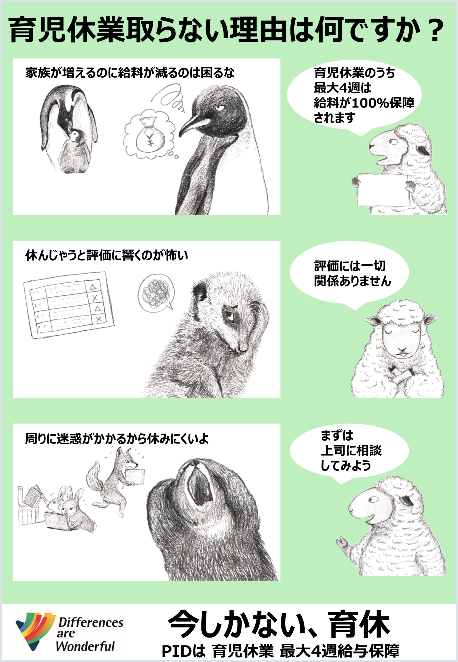 DEIに関連する情報がより多くの社員の目に触れるよう、働き方や育児休業取得を促すポスターを制作しています。これらのポスターは、社内掲示板やポータルサイト、デジタルサイネージなどを活用して全社員に向けて発信しており、日常的に目にする場面での周知を通じて、DEIの理解と浸透を図っています。