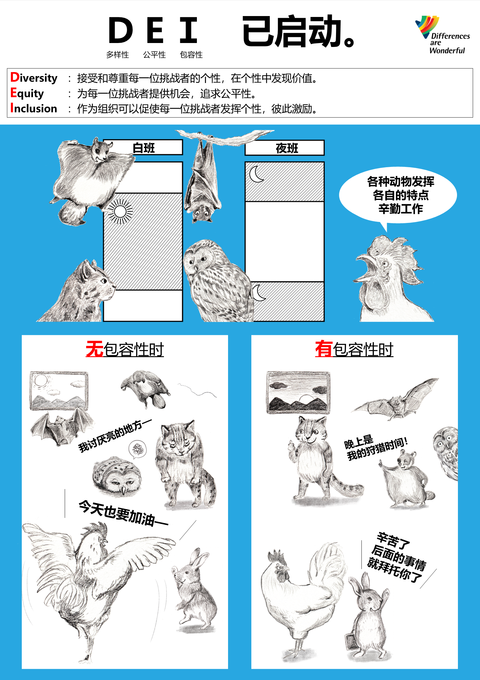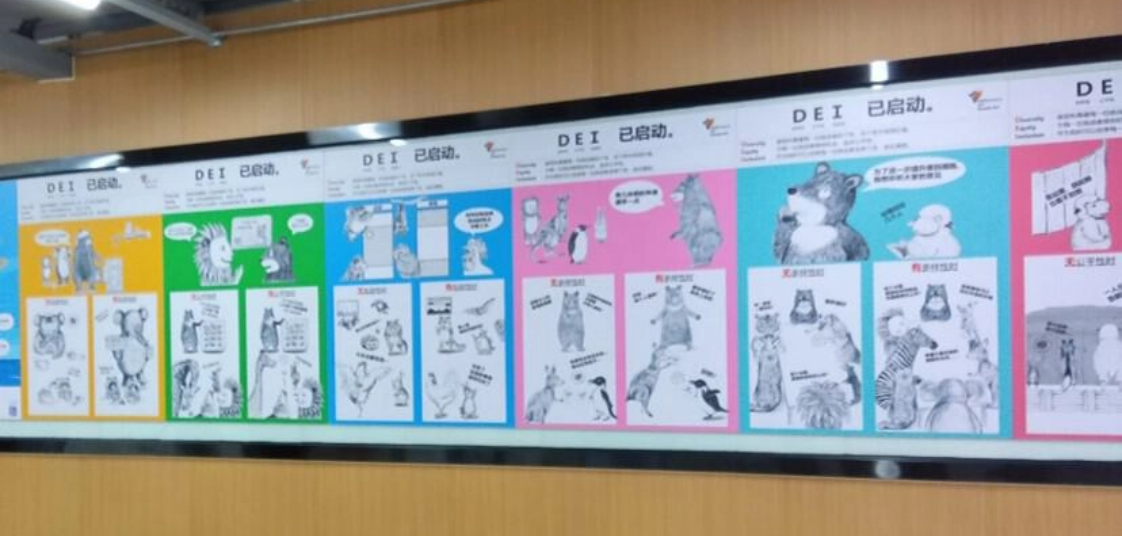 英語・中国語版のDEIポスターを作成し、海外拠点に展開しています。一部拠点では壁一面に掲示するなど、積極的にDEI活動を推進。さらに国内拠点では礼拝室を設置し、宗教・文化の多様性に配慮した環境づくりを進めています。国籍を問わず、誰もが安心して働ける職場を目指しています。
