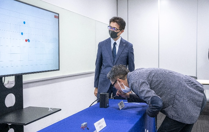 これほど感度の高い嗅覚をもってしても、人は誰かの呼気で個人認証をすることはできません。つまり、この人工嗅覚センサは、すでに人を超えた嗅覚レベルを達成しているのです。2022年11月11日の記者発表では、開発品のモジュールを展示し、呼気を解析するデモ展示を行いました。チューブから息を吹き込むと、瞬時に特性を分析して個々がモニター上にマッピングされます。プロジェクト立ち上げから感応膜・センサの研究に携わる中尾厚夫は「ケミカルセンサの開発で最も難しいのが、分子に対する応答の再現性。2014年に始まった嗅覚への挑戦は、16チャンネルで実現した高感度で、一つの大きな山を越えたと思っています」と技術の到達点に自信を示します。